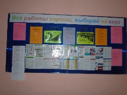 Для обучающихся 1-9 классов были оформлены стенды и уголки профориентации. С помощью оформленных стендов обучающиеся узнали больше информации о профессиях, которые востребованы в Кемеровской области и ознакомились с материалами для поступления в ВУЗы и колледжи, техникумы.