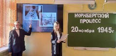 Учащимся 9-го класса представлена слайдовая презентация с фотографиями и документами, отражающими ужасы тех лет, продемонстрированы кадры кинохроники Нюрнбергского суда и рассказано о "Суде истории", на котором были вынесены обвинения нацистским преступникам, участвовавшим в преступлениях против мира, человечности и в военных преступлениях. Обвинительные приговоры на этом процессе подтвердили, что террор и агрессия, направленные против мирного населения, никогда не остаются безнаказанными.