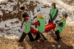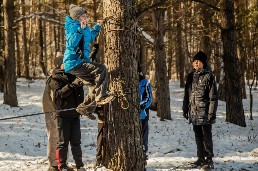 На туристской полосе препятствий участники вязали узлы, накладывали повязку и транспортировали пострадавшего, преодолевали параллельные перила, спуски и подъемы.